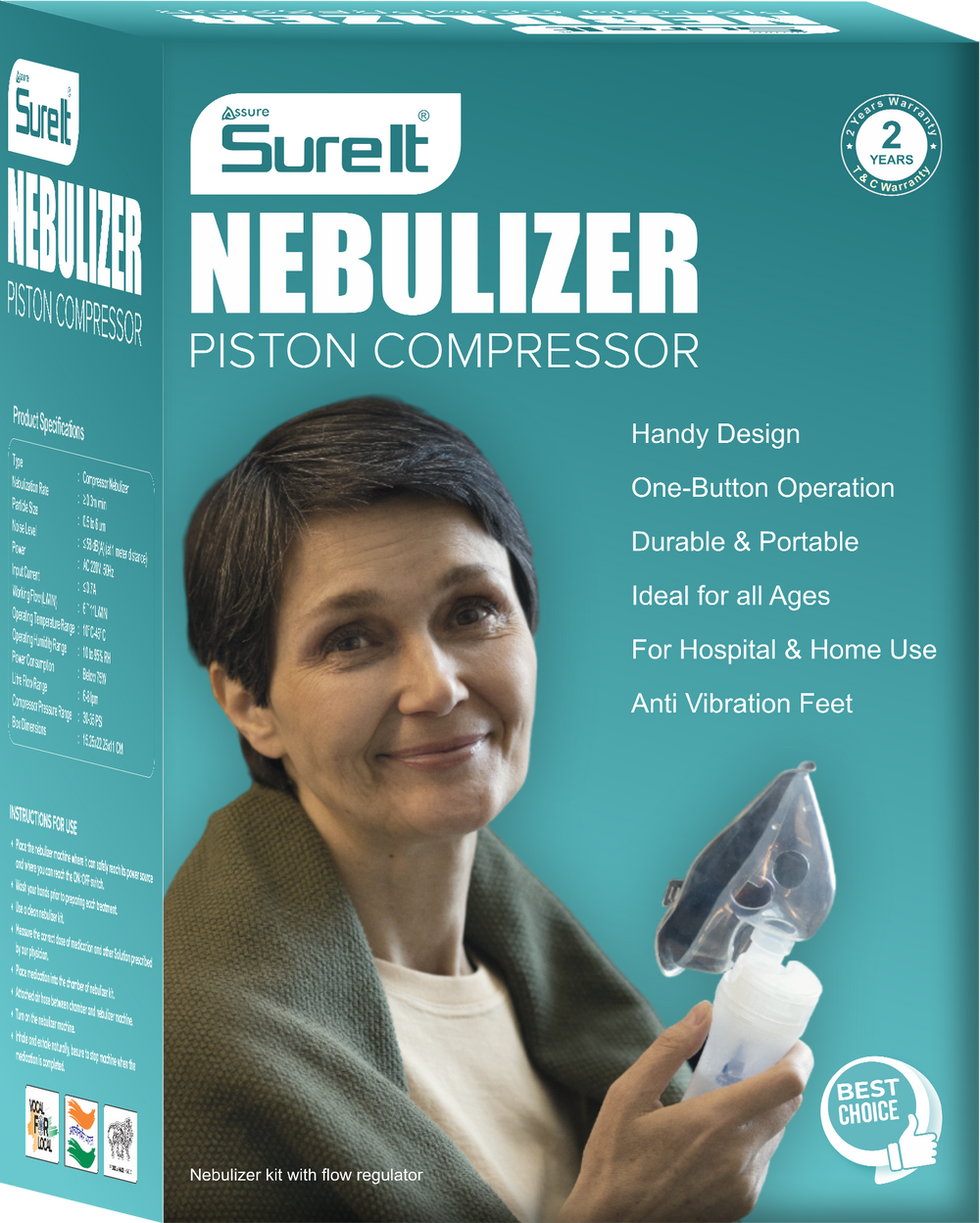 Enjoy effective respiratory therapy with the SureIt Piston Compressor Nebulizer, which is suitable for both hospital and home use. This one-button, medical-grade nebulizer has a convenient, portable design that is accessible to patients of all ages. With its rugged build, anti-vibration feet, and flow regulator, this nebulizer provides stable medication delivery with low noise. Supported by a 2-year warranty, the SureIt Nebulizer supports professional-level performance with convenience-driven design, standing as the ultimate option for treating respiratory issues effectively and effectively.
