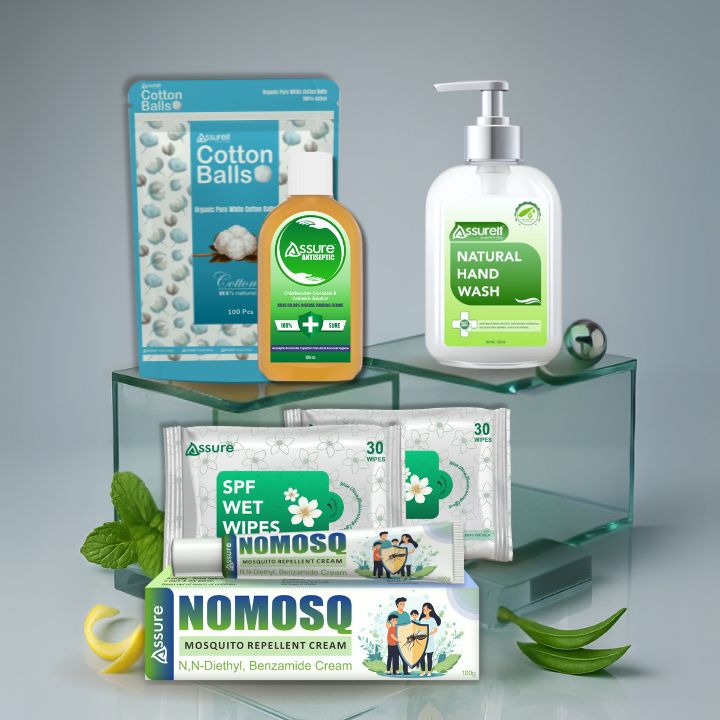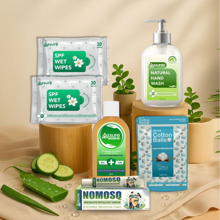 Stay clean, protected, and refreshed with the Assure Daily Hygiene & Protection Combo – a complete care pack designed for everyday personal and family use. Whether at home or on the go, this essential set keeps you safe from germs, sun exposure, and insect bites, while maintaining hygiene and skin comfort.