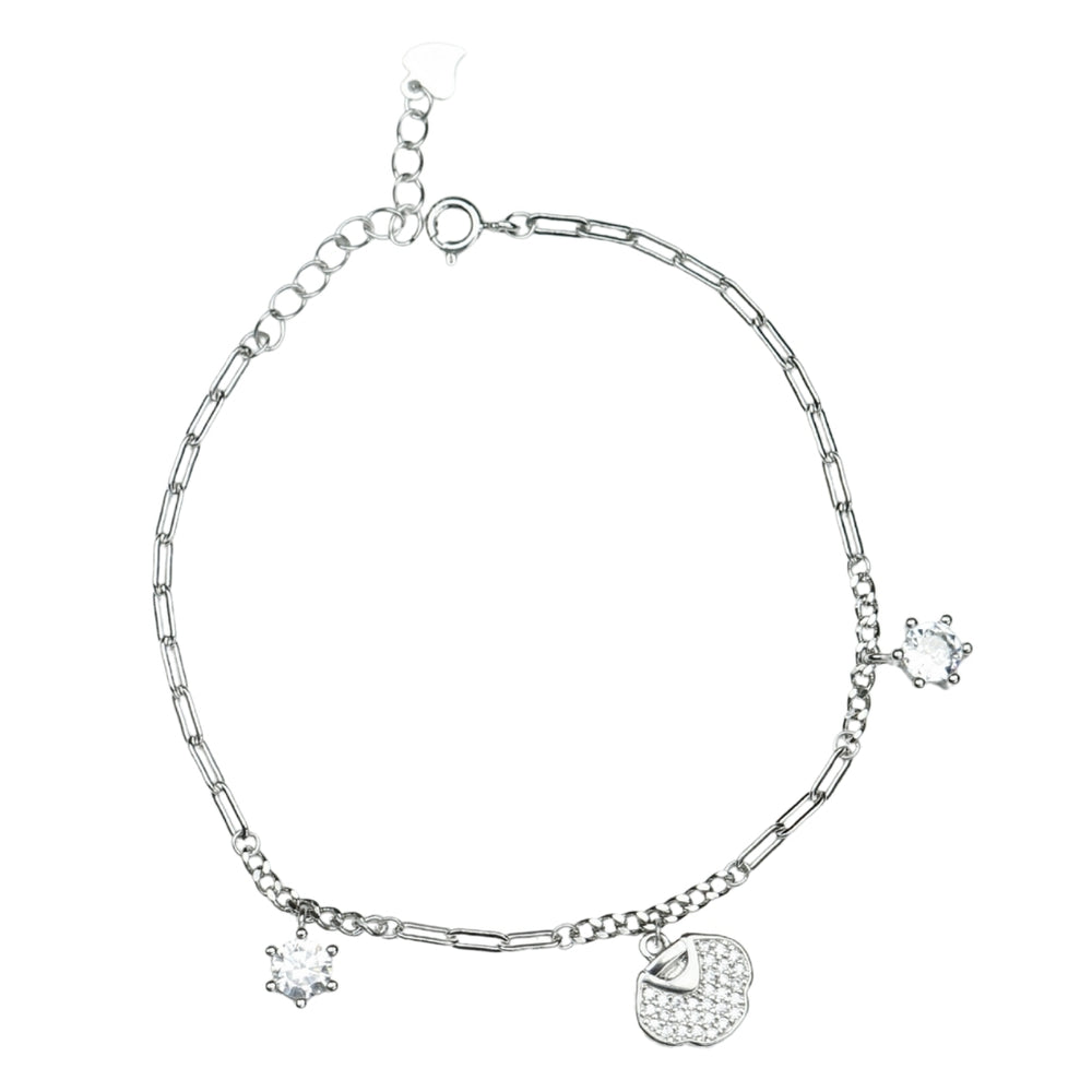 A delicate 925 silver bracelet featuring sparkling crystal charms and a pave apple accent, paired with a modern mixed-link chain for a chic everyday shine.