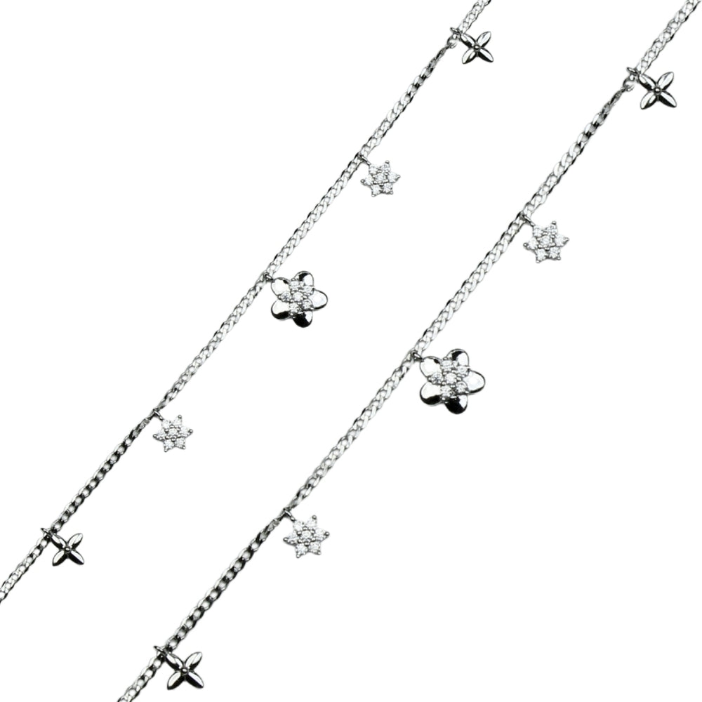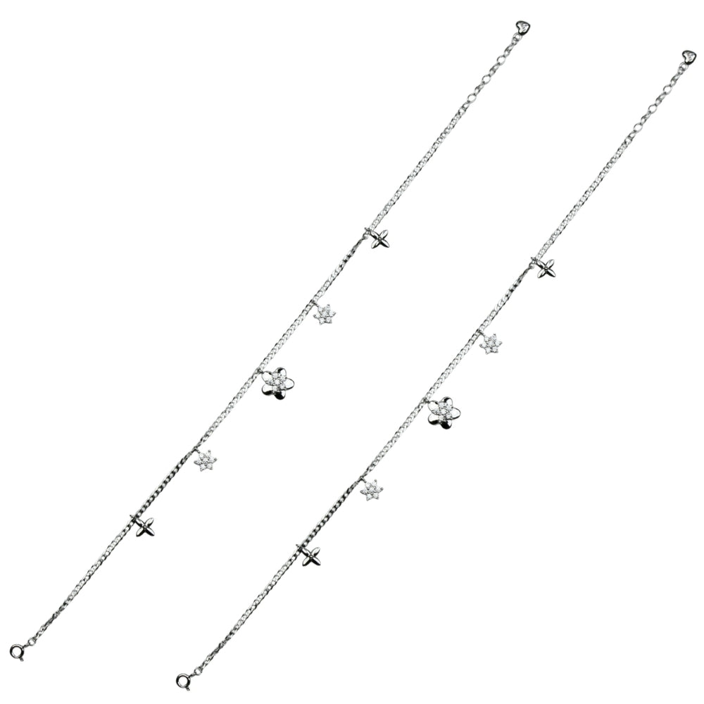 This delicate anklet set features two beautifully crafted silver chains decorated with tiny star and flower charms. The lightweight design adds a soft sparkle to your feet, making it perfect for daily wear or special occasions. Comfortable, stylish, and easy to pair with any outfit, this dual anklet set brings a graceful, feminine touch to your look.