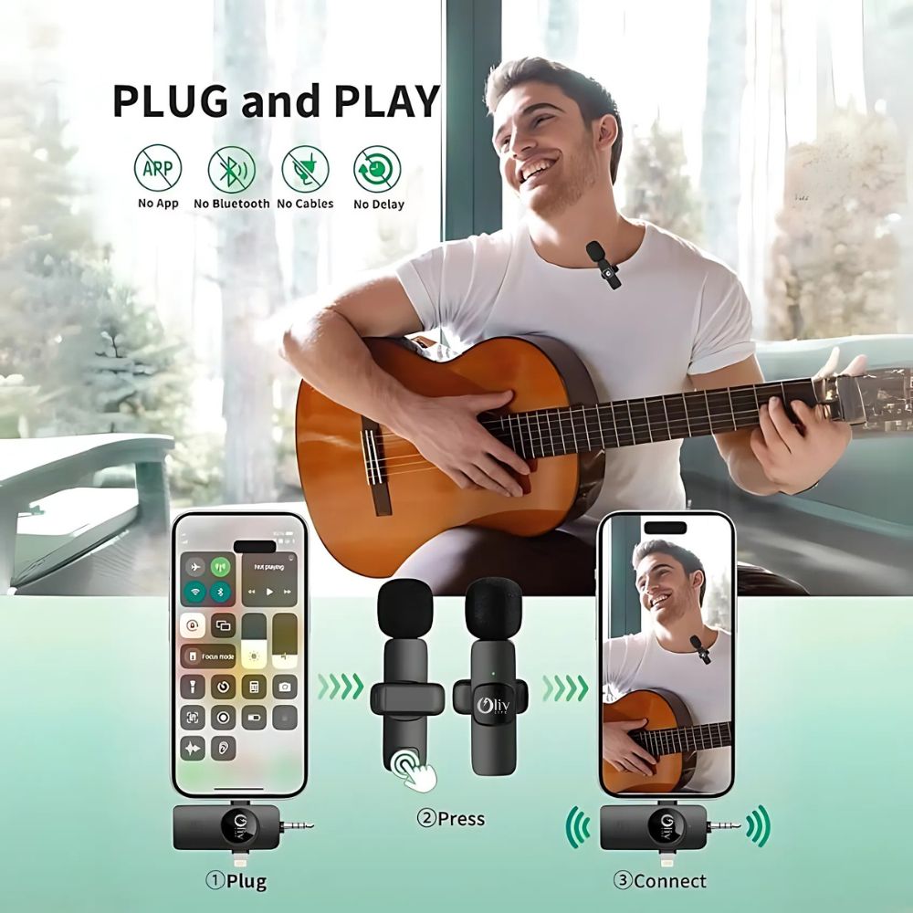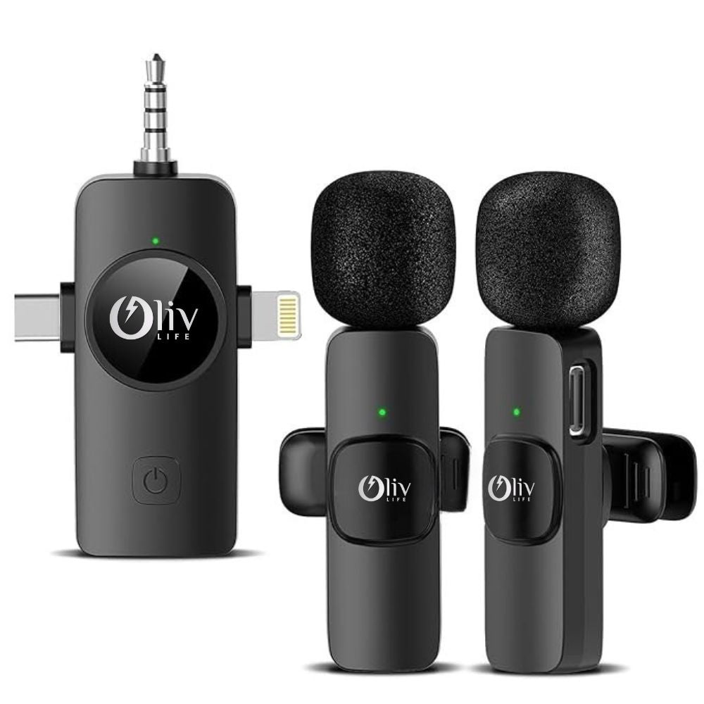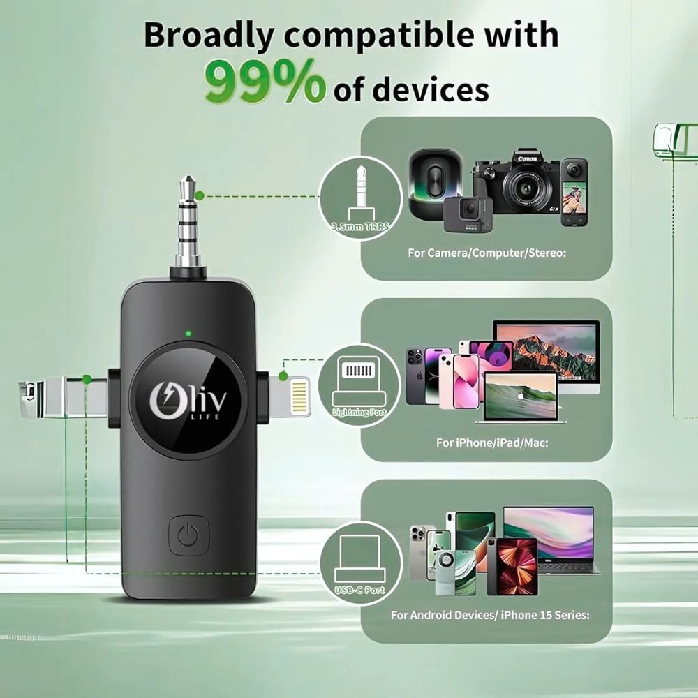 OlivLife Universal 3-in-1 Compatibility Comes with Lightning, USB-C, and 3.5mm adapters ā works seamlessly with iPhones, Android phones, iPads, DSLR cameras, and laptops. ?? Advanced Noise Cancellation Built-in smart noise reduction chip filters out background sounds, delivering clean, professional-grade audio. ?? Plug & Play ā No App or Bluetooth Needed Instantly connects without additional software ā perfect for quick setups and spontaneous recordings. ?? 20M Wireless Transmission Range Record from a distance without dropouts ā ideal for YouTube videos, interviews, and outdoor shoots. Lightweight & Portable Clip-on design with included carry case ā easy to use on the go.