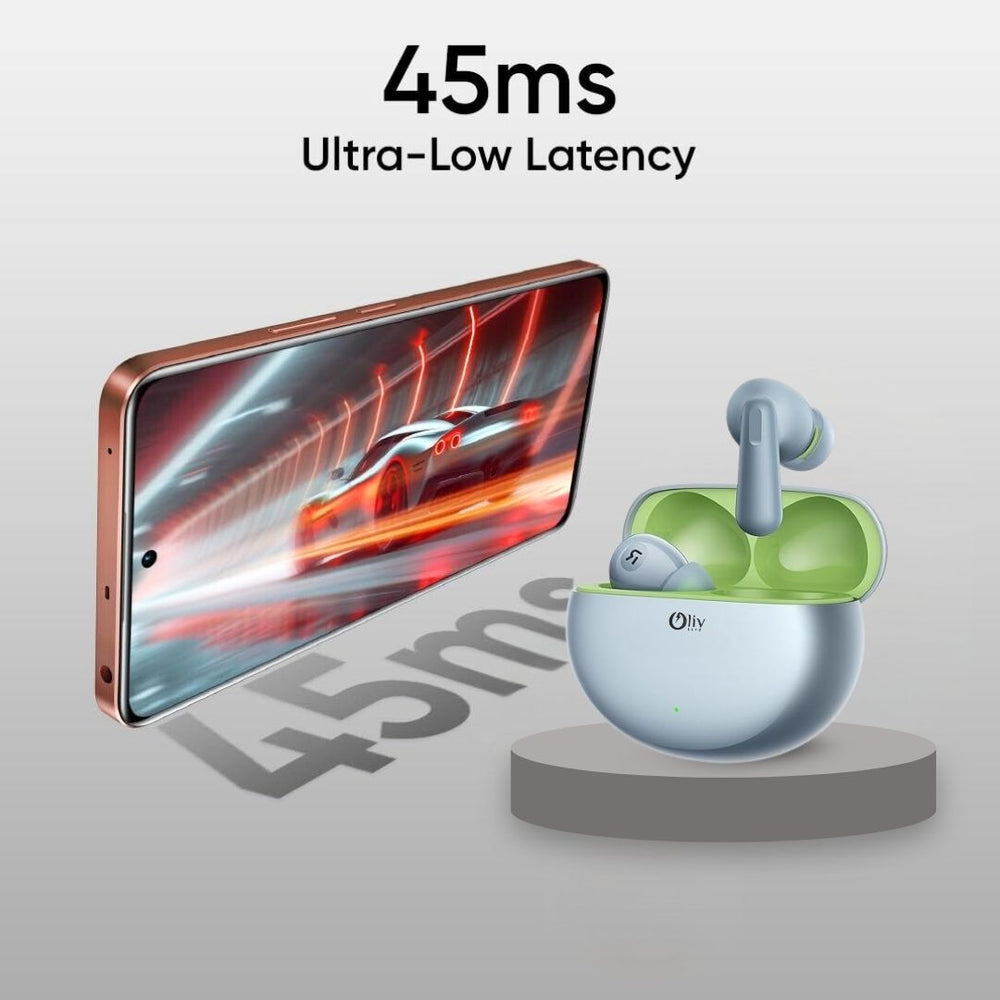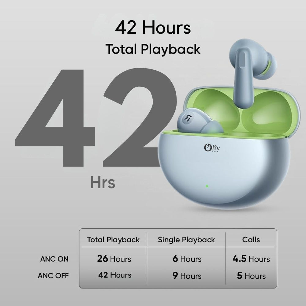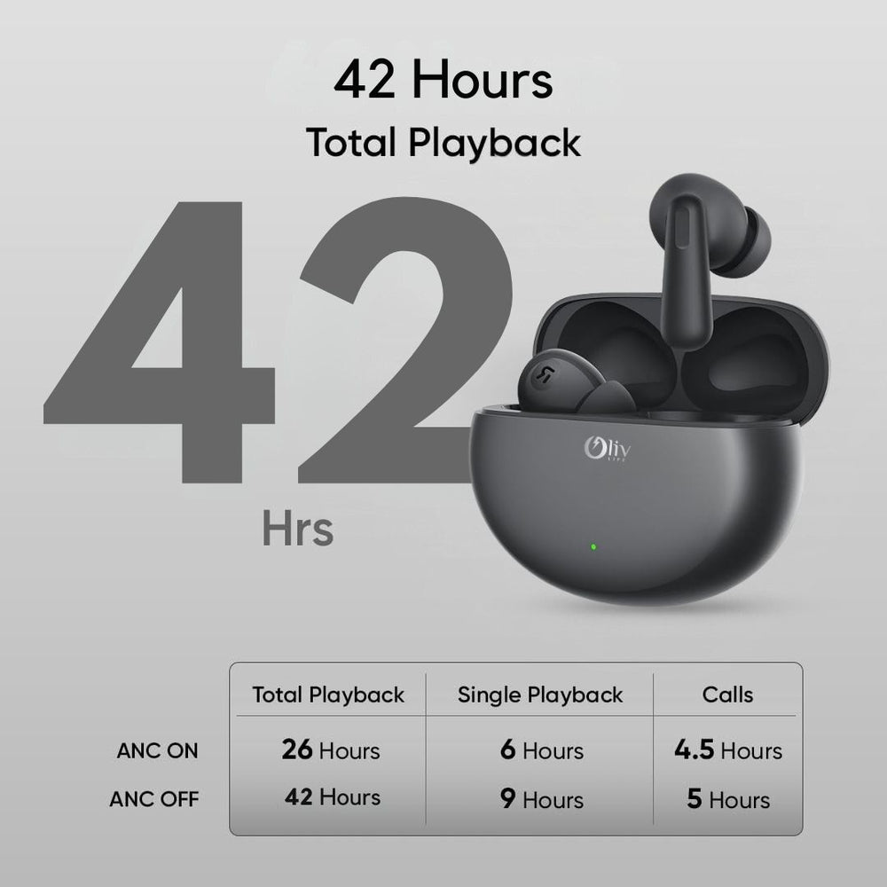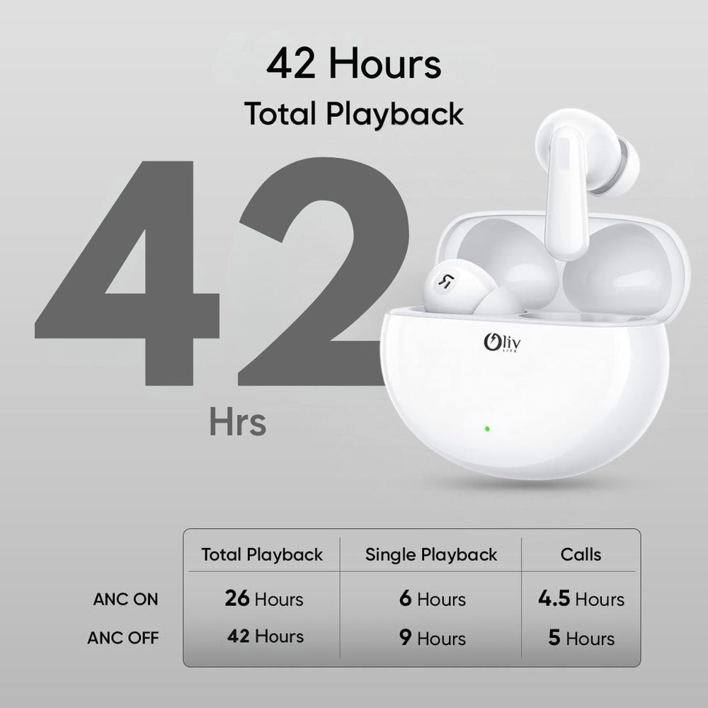 Model Name: OlivLife Glide Wireless Earbuds Type: True Wireless Earbuds Noise Control: Active Noise Cancellation Sensitivity: Not Specified Driver Type: Dynamic Driver Connectivity: Bluetooth 5.4 Headphone Jack: No Jack Control Method: Touch / Media Control Earpiece Shape: In-Ear (Bud) Water Resistance: Yes (Water Resistant) Uses: Gaming, Music, Travel Compatible Devices: Smartphones Included Components: Cable Material: Plastic Style: In-Ear, Wireless Weight: 46 g Dimensions: 6.7 x 5.1 x 2.5 cm Batteries Required: 1 AA battery (included) Battery Life: 43 Hours Net Quantity: 1 Count Manufacturer: Oliv Life Country of Origin: India