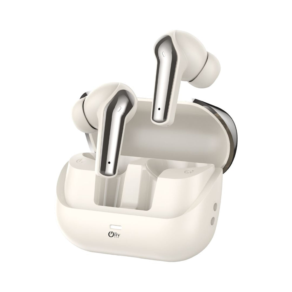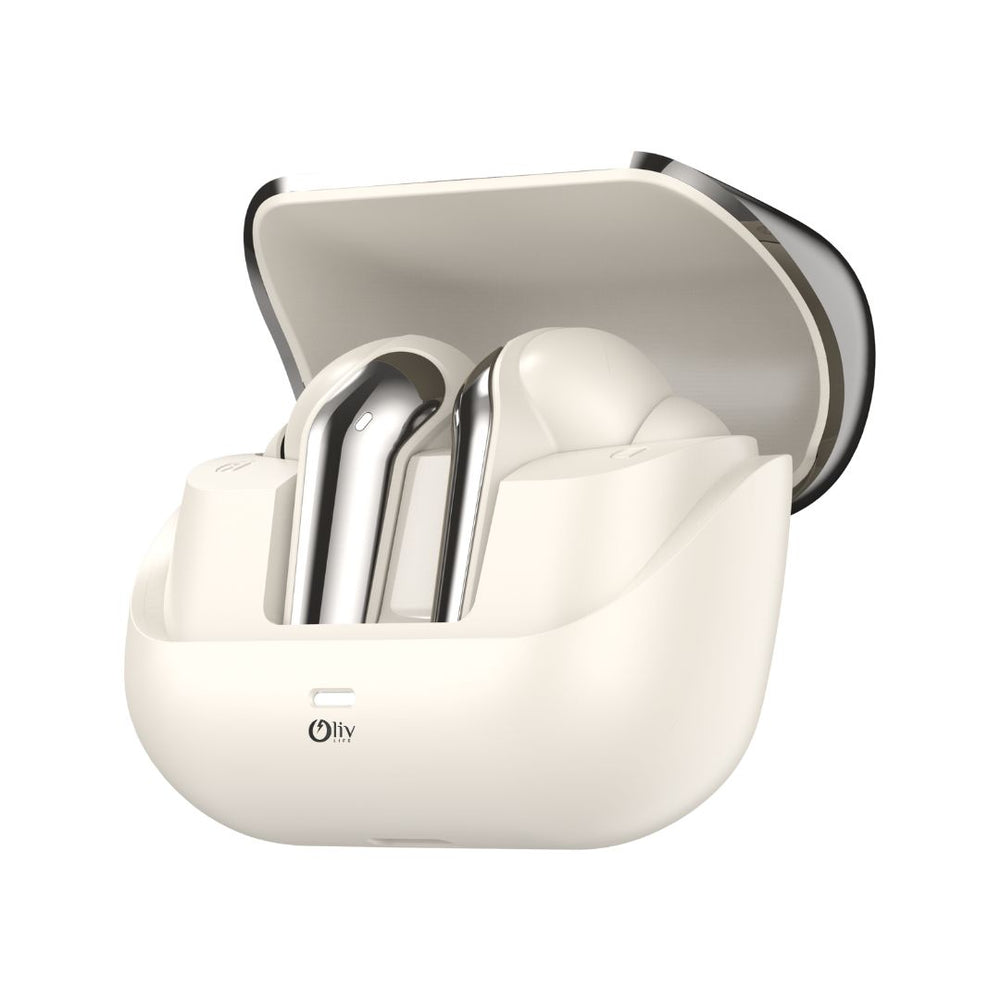 Experience premium wireless audio with these sleek and stylish earbuds from Oliv Life. The elegant white design features chrome accents and a compact charging case for both protection and power on the go. These wireless earbuds deliver crystal-clear sound while maintaining a comfortable, secure fit for extended listening sessions. The charging case displays convenient LED indicators to monitor battery status, while the earbuds themselves feature intuitive touch controls for easy operation. Perfect for daily commutes, workouts, or casual listening, these earbuds seamlessly pair with your devices for a truly wireless audio experience. The ergonomic design ensures they stay firmly in place, while the minimalist aesthetic complements any style. Each earbud has a small LED indicator to show connection status, making it simple to know when they're ready to use.
