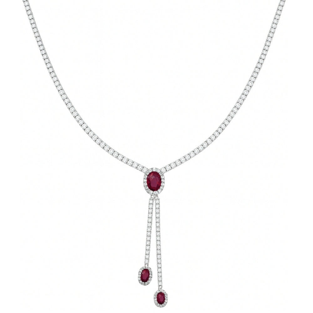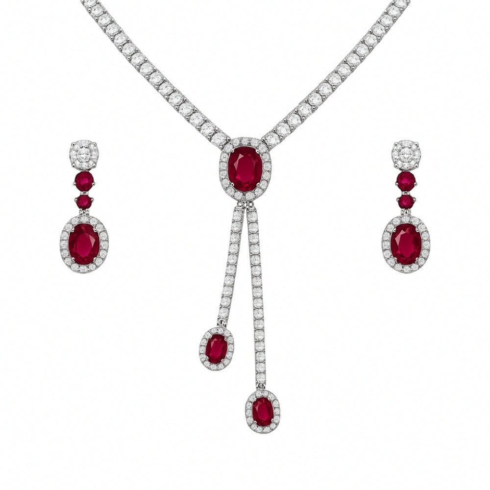 A stunning silver jewellery set featuring deep pink ruby-style stones framed with shimmering crystals. The necklace’s graceful drop design and matching earrings create a luxurious, timeless look perfect for weddings, parties, and special occasions.